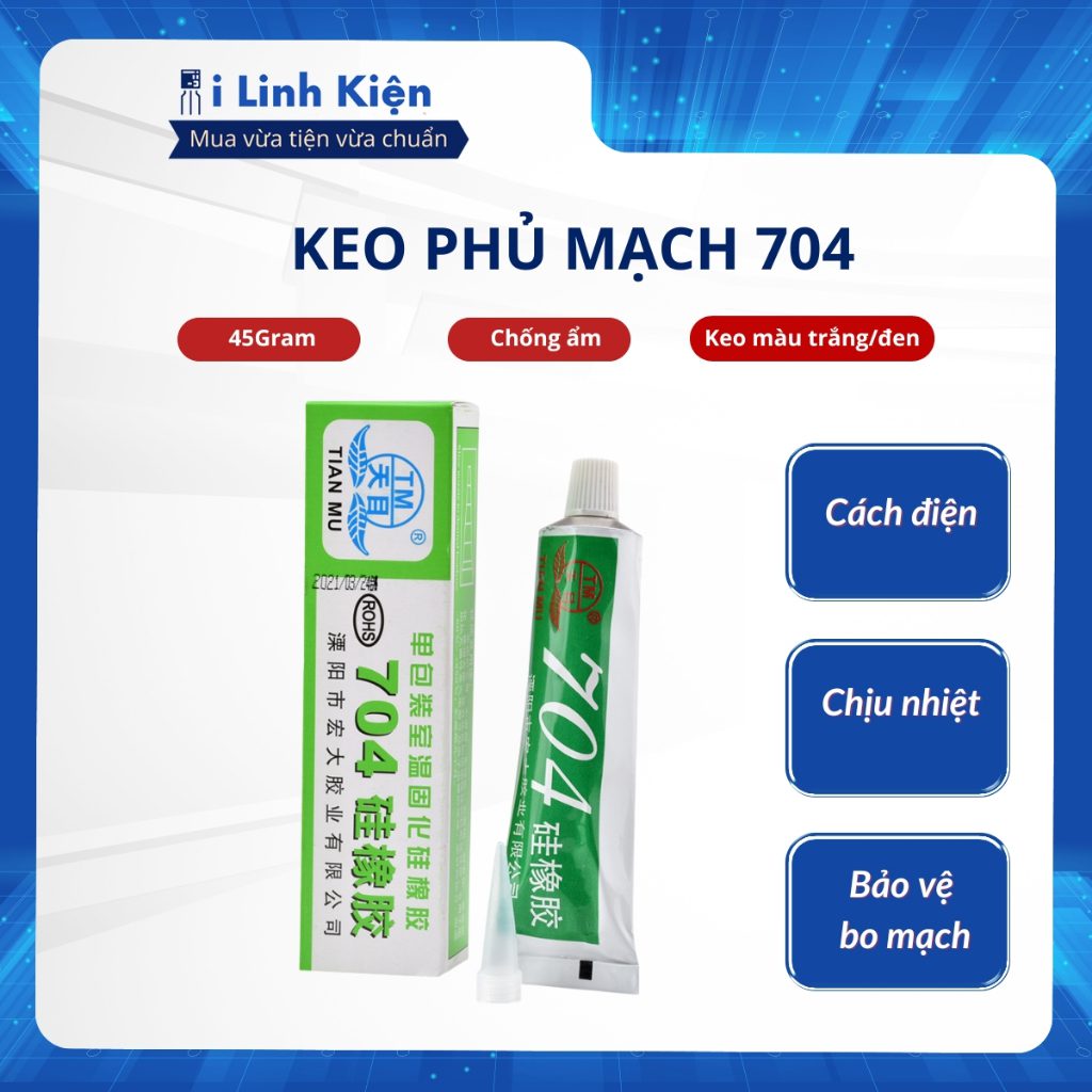 Keo 704 màu trắng sữa , màu đen không độc hại, không gây ô nhiễm môi trường, không bị ăn mòn. Keo 704 dễ bảo quản ở nhiệt độ phòng và dễ sử dụng. Nó thường được dùng để cách nhiệt, hàn kín hoặc gắn kết các bộ phận làm nóng bằng điện như mâm nhiệt, bàn là ,gắn cao áp, chống ẩm và sử dụng trong các thiết bị điện tử. Thông số kỹ thuật keo 704