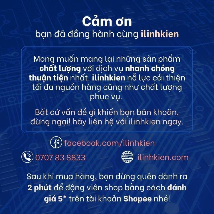 ILinhkien với phương châm “Tất cả vì khách hàng” nên shop luôn không ngừng đổi mới từng ngày để đem lại trải nghiệm tuyệt vời cho khách hàng khi mua sắm tại shop . Những vấn đề đơn hàng shop luôn xử lý nhanh nhất để làm sao sản phẩm tới tay người mua một cách nhanh chóng vì iLinhkien hiểu rằng Khách hàng luôn muốn một sản phẩm tốt và giao nhanh khi mua sắm trên sàn thương mai điện tử . Khi nhận được đơn hàng shop rất mong được đánh giá 5 sao từ người mua vì đó là động lực để shop phục vụ khách hàng tốt hơn nữa , trong trường hợp quý khách hàng không hài lòng về vấn đề gì đừng vội đánh giá 1 sao mà hãy liên hệ với shop để phản ánh.