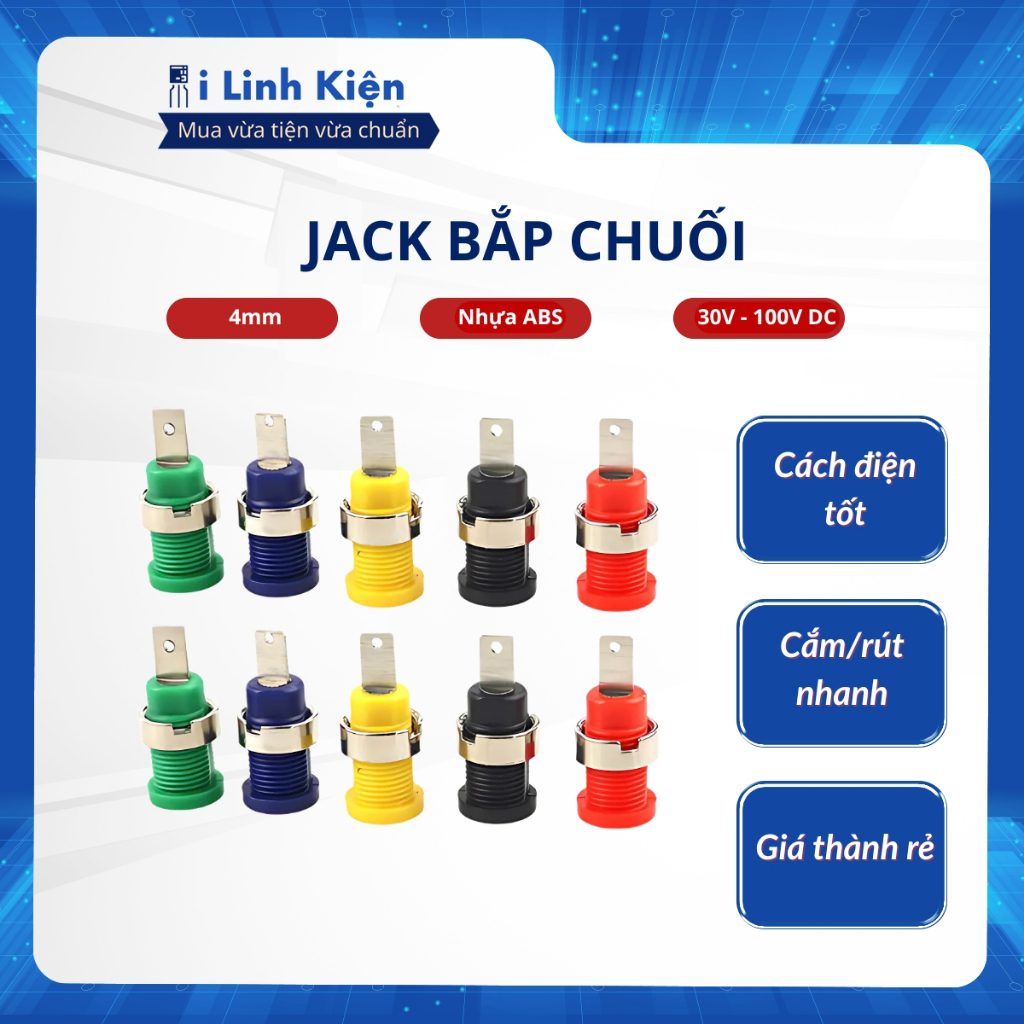 Jack bắp chuối 4mm cái màu đỏ, đen, vàng, xanh lá, xanh dương chất lượng tốt.