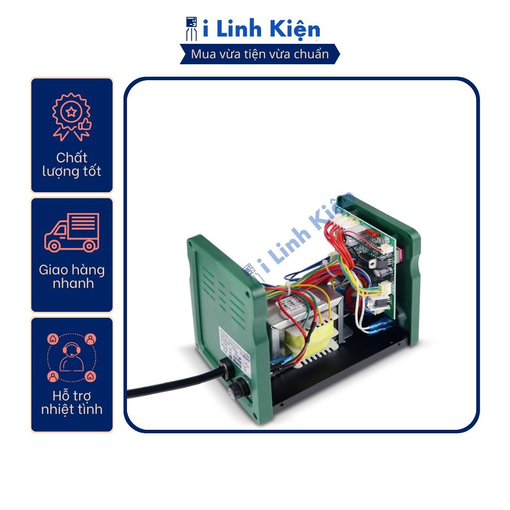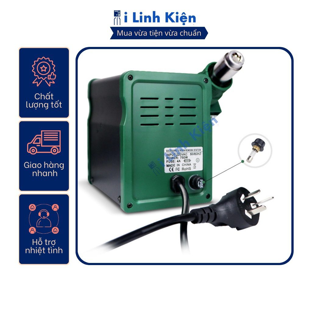 6. Máy được trang bị chức năng bảo vệ an toàn. Thông số kỹ thuật trạm khò : – Điện áp vào : 220V..