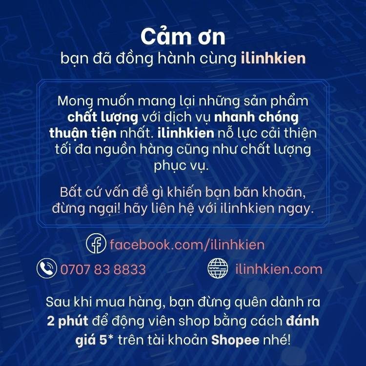 ILinhkien với phương châm “Tất cả vì khách hàng” nên shop luôn không ngừng đổi mới từng ngày để đem lại trải nghiệm tuyệt vời cho khách hàng khi mua sắm tại shop. Những vấn đề đơn hàng shop luôn xử lý nhanh nhất để làm sao sản phẩm tới tay người mua một cách nhanh chóng vì iLinhkien hiểu rằng, Khách hàng luôn muốn một sản phẩm tốt và giao nhanh khi mua sắm trên sàn thương mai điện tử. Khi nhận được đơn hàng shop rất mong được đánh giá 5 sao từ người mua vì đó là động lực để shop phục vụ khách hàng tốt hơn nữa. Trong trường hợp quý khách hàng không hài lòng về vấn đề gì đừng vội đánh giá 1 sao mà hãy liên hệ với shop để phản ánh.