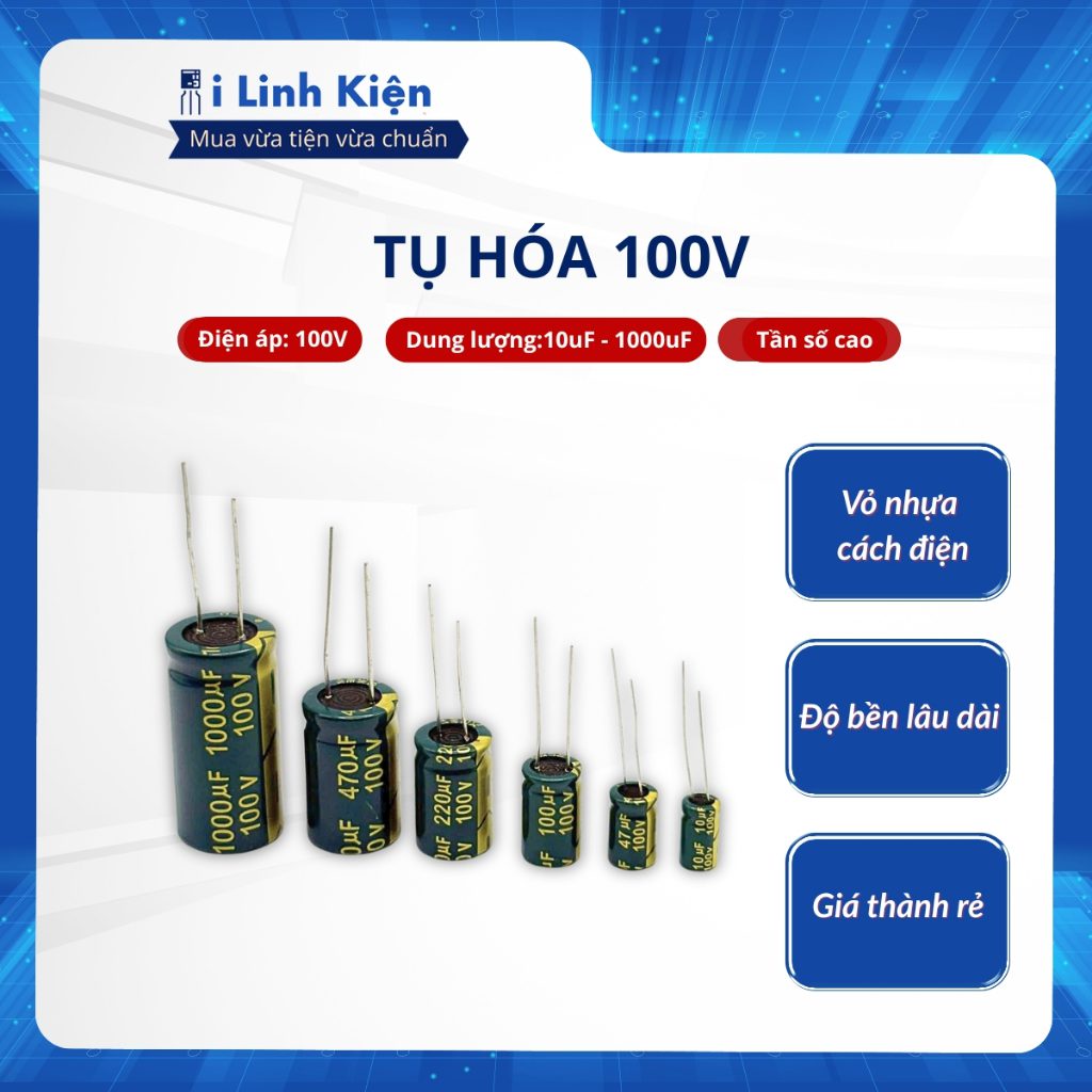 - Tụ hóa 100V 10uF 6,3x11mm – Tụ hóa 100V 47uF 10x13mm – Tụ hóa 100V 100uF 10x17mm – Tụ hóa 100V 220uF 13x21mm – Tụ hóa 100V 470uF 16x25mm